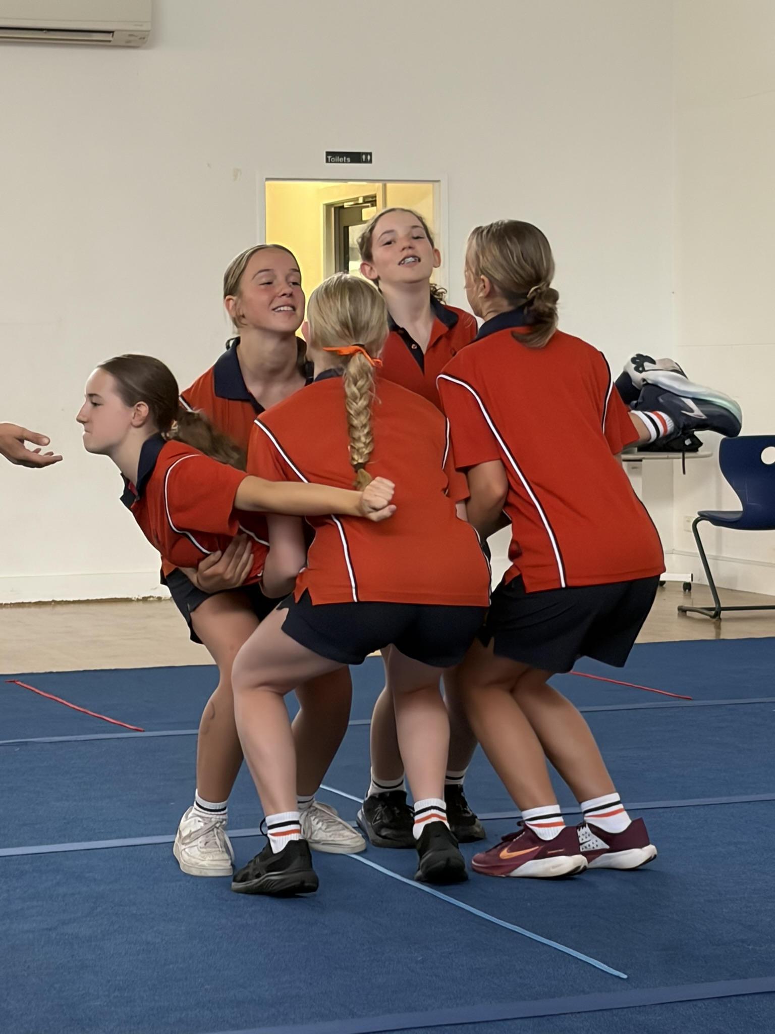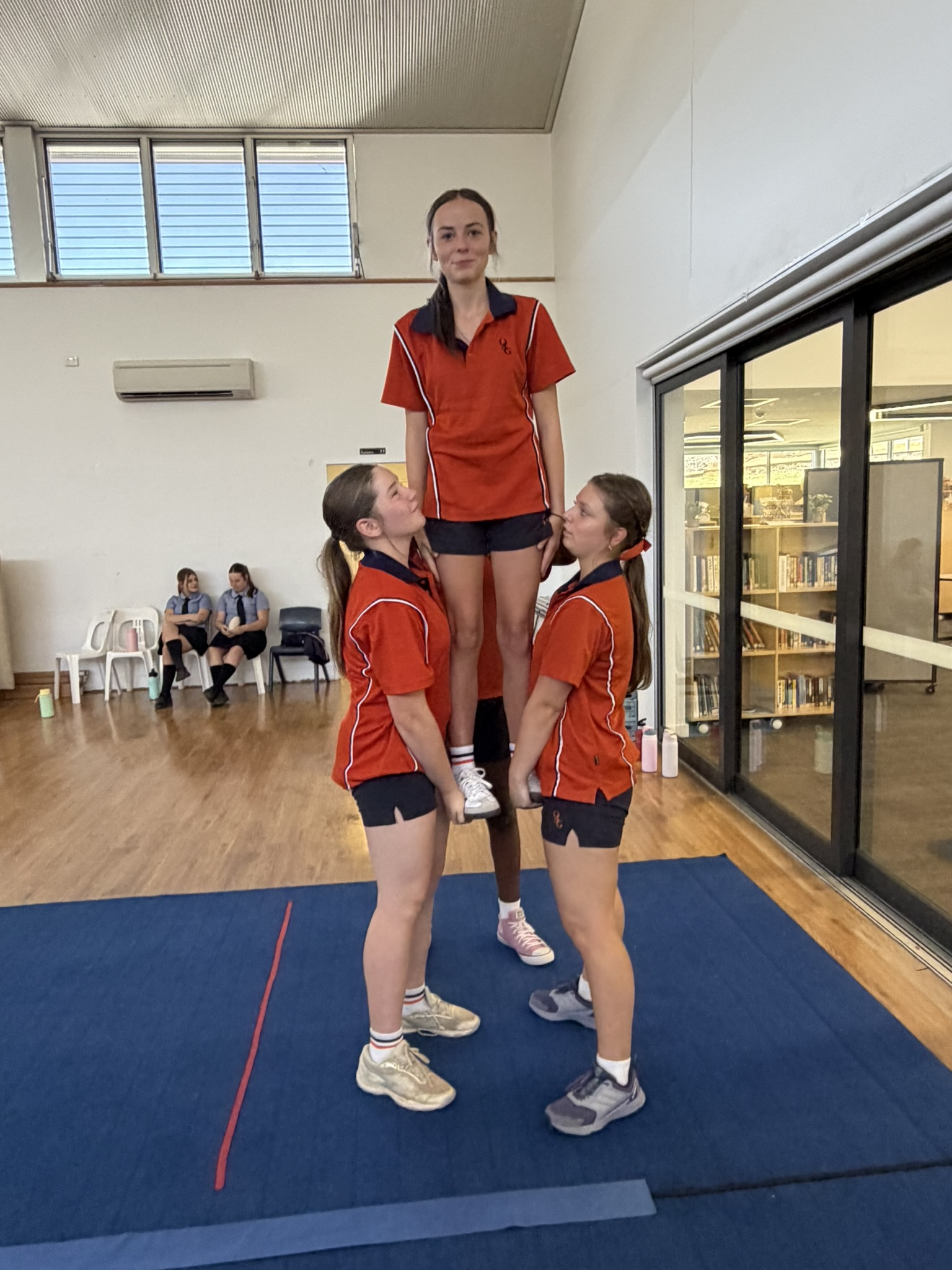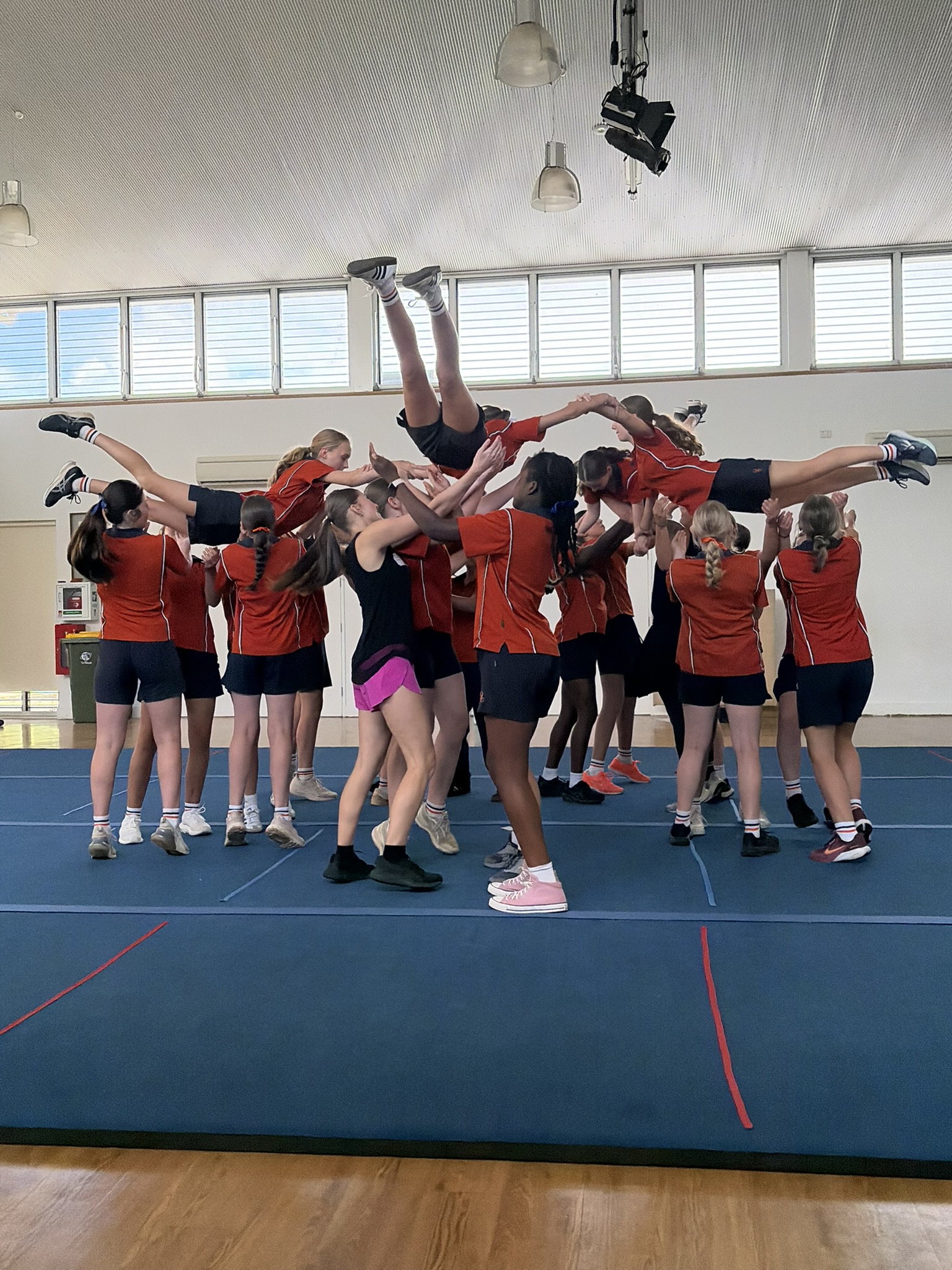 Cheerleading has started up as an optional Senior School weekly sport, and 24 very enthusiastic, capable, bubbly Stage 5 students have been jumping, rolling, spinning and catching each other. This sport is NOT for the faint of heart.